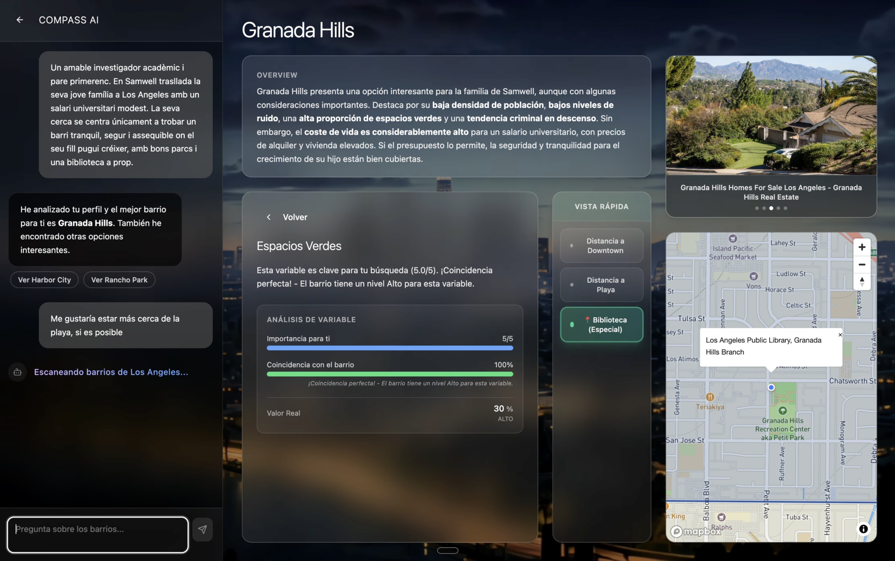 Sistema que encuentra tu ubicación ideal en Los Ángeles mediante una conversación natural. Analiza en tiempo real factores críticos como seguridad, demografía y servicios cercanos para ofrecerte recomendaciones personalizadas, actuando como un consultor inmobiliario experto disponible 24/7.